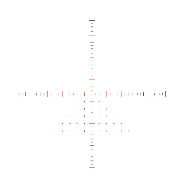 The 20x Half Mil reticle is calibrated at 20x magnification, offering accurate half mil spaced markings out beyond 5 Mil in all directions. Crosses etched on the lower reticle add extra windage aimpoints, while segmented outer posts divided into half mil and 0.2 mil spacings provide quick references for bracketing and rangefinding.